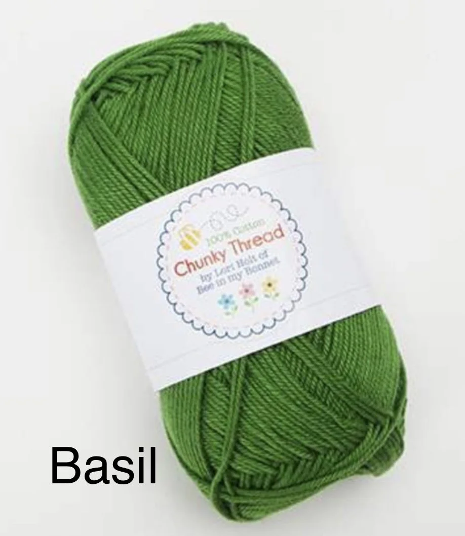 Lori Holt's Chunky Thread is 100% cotton and is sport weight. It's perfect for knitting, crochet, punch needle or other crafts. Each skein is 50 grams (approximately 140 yards or 128 meters).